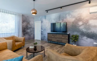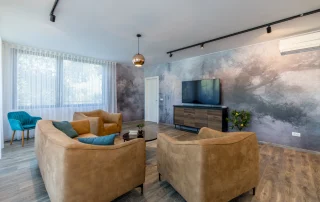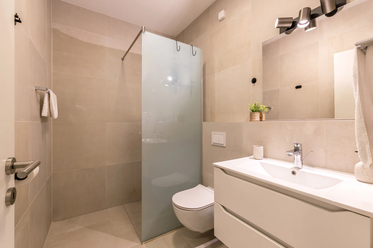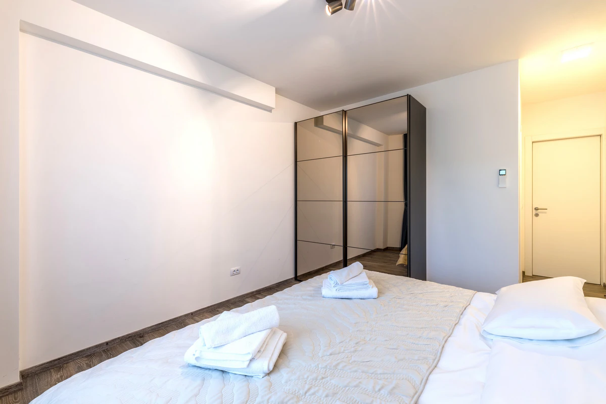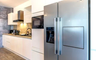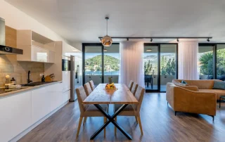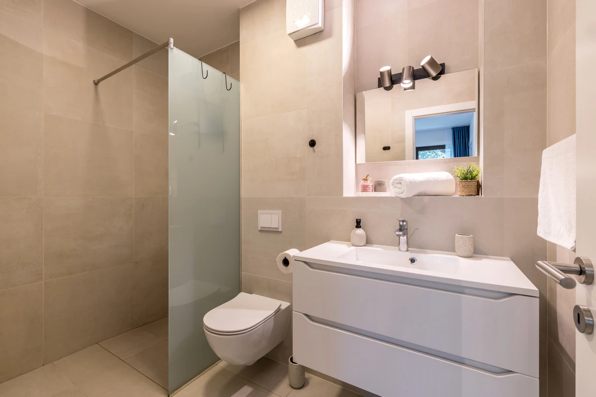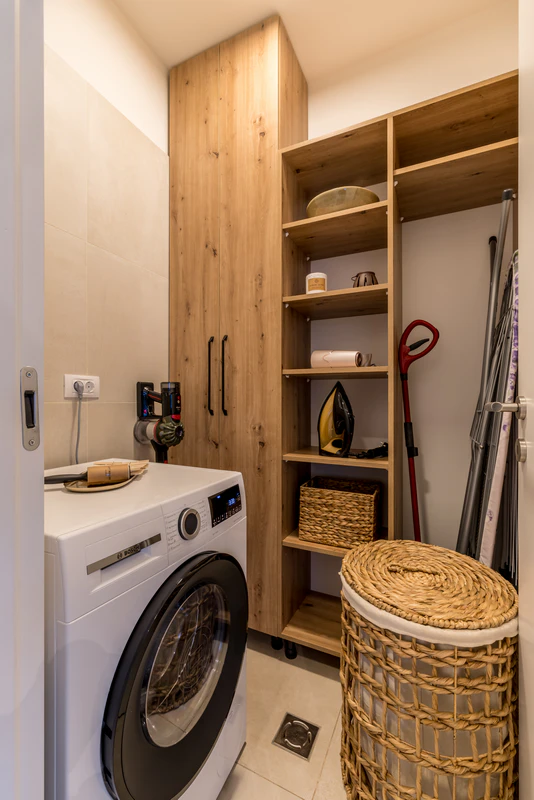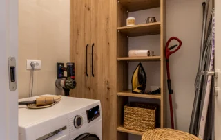 Die Küche ist komplett ausgestattet mit Induktionsherd, Geschirrspüler, Kühlschrank, Mikrowelle, Segafredo-Kaffeemaschine, Wasserkocher, Toaster und allen notwendigen Bestecken und Utensilien für die Zubereitung Ihrer Lieblingsgerichte. Für zusätzlichen Komfort verfügt das Apartment über einen Hauswirtschaftsraum mit Waschmaschine/Trockner, Dyson-Staubsauger, Bügelmöglichkeiten und Haartrockner.