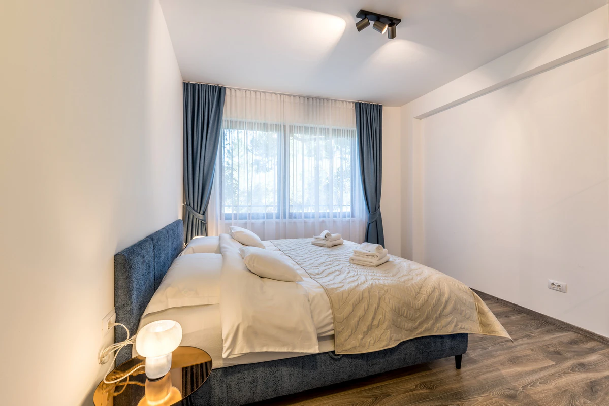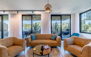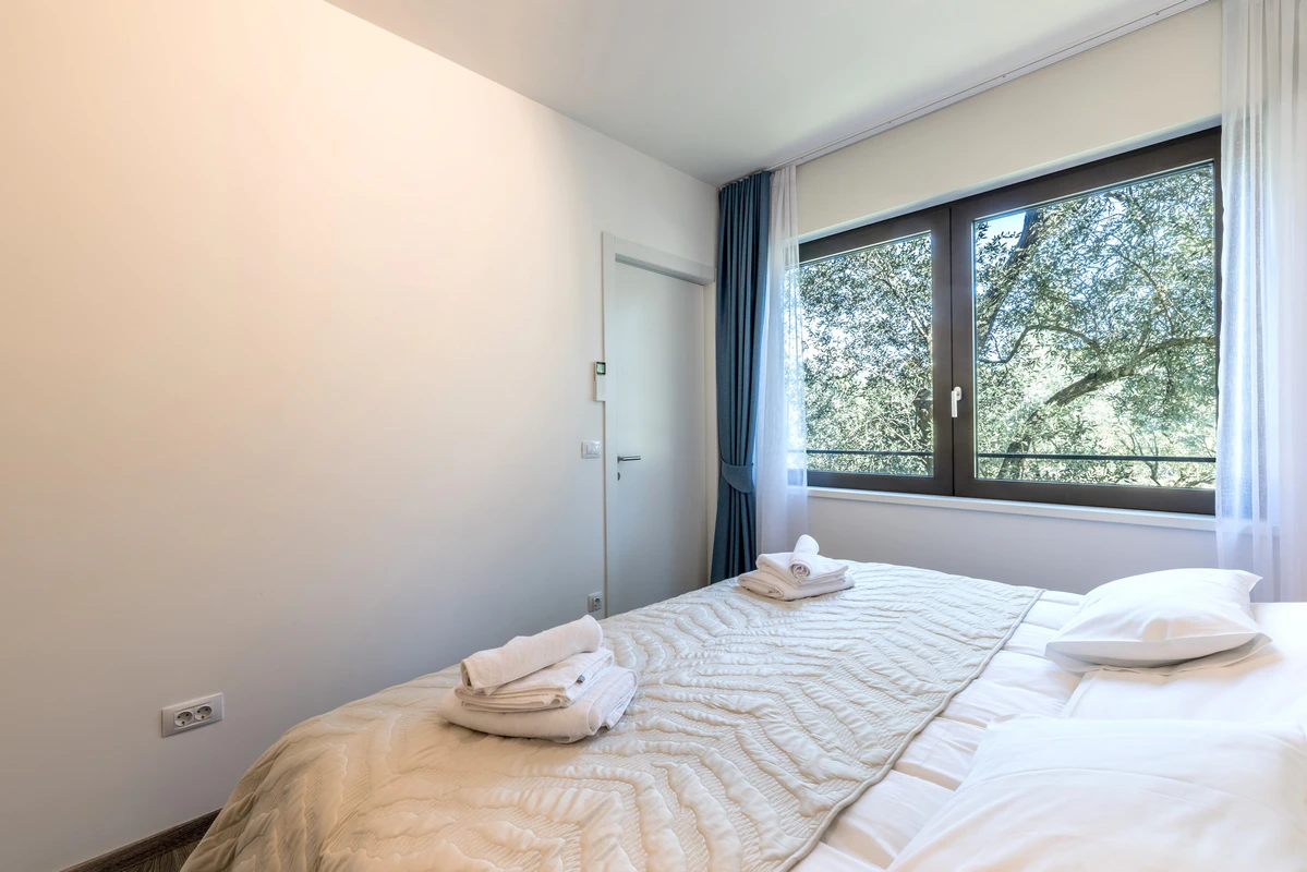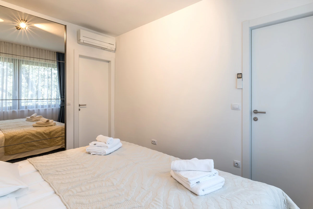 Dieses Apartment mit zwei Schlafzimmern (105 m²) verfügt über ein Kingsize-Bett (200 x 200), eine Klimaanlage und ein eigenes Bad mit begehbarer Dusche in jedem Schlafzimmer. Das Wohnzimmer mit großen Fenstern und Meerblick ist mit Kabelfernsehen, WLAN und Klimaanlage ausgestattet und verfügt über ein Sofa, auf dem auf Anfrage eine fünfte Person (Kind) untergebracht werden kann.