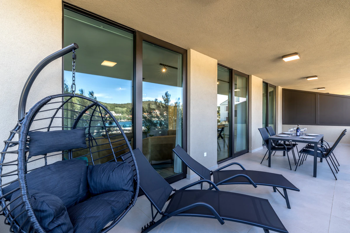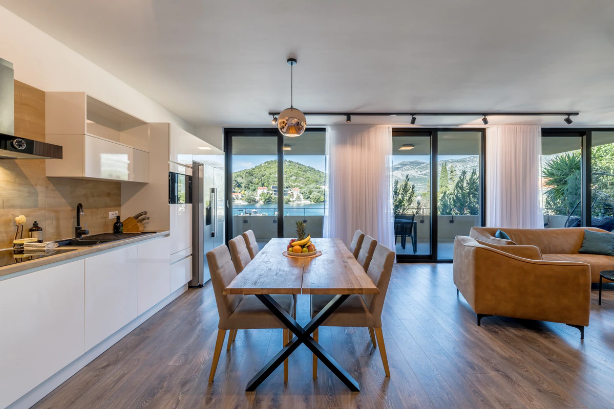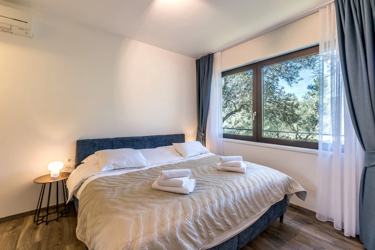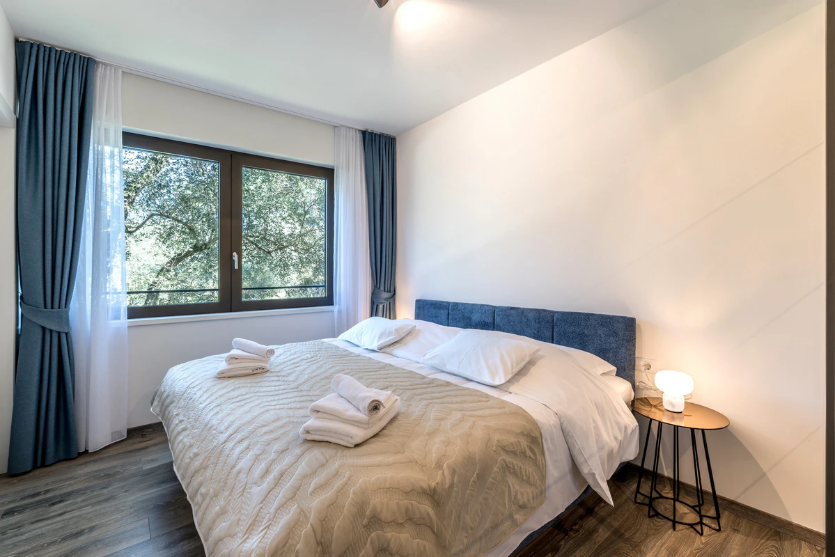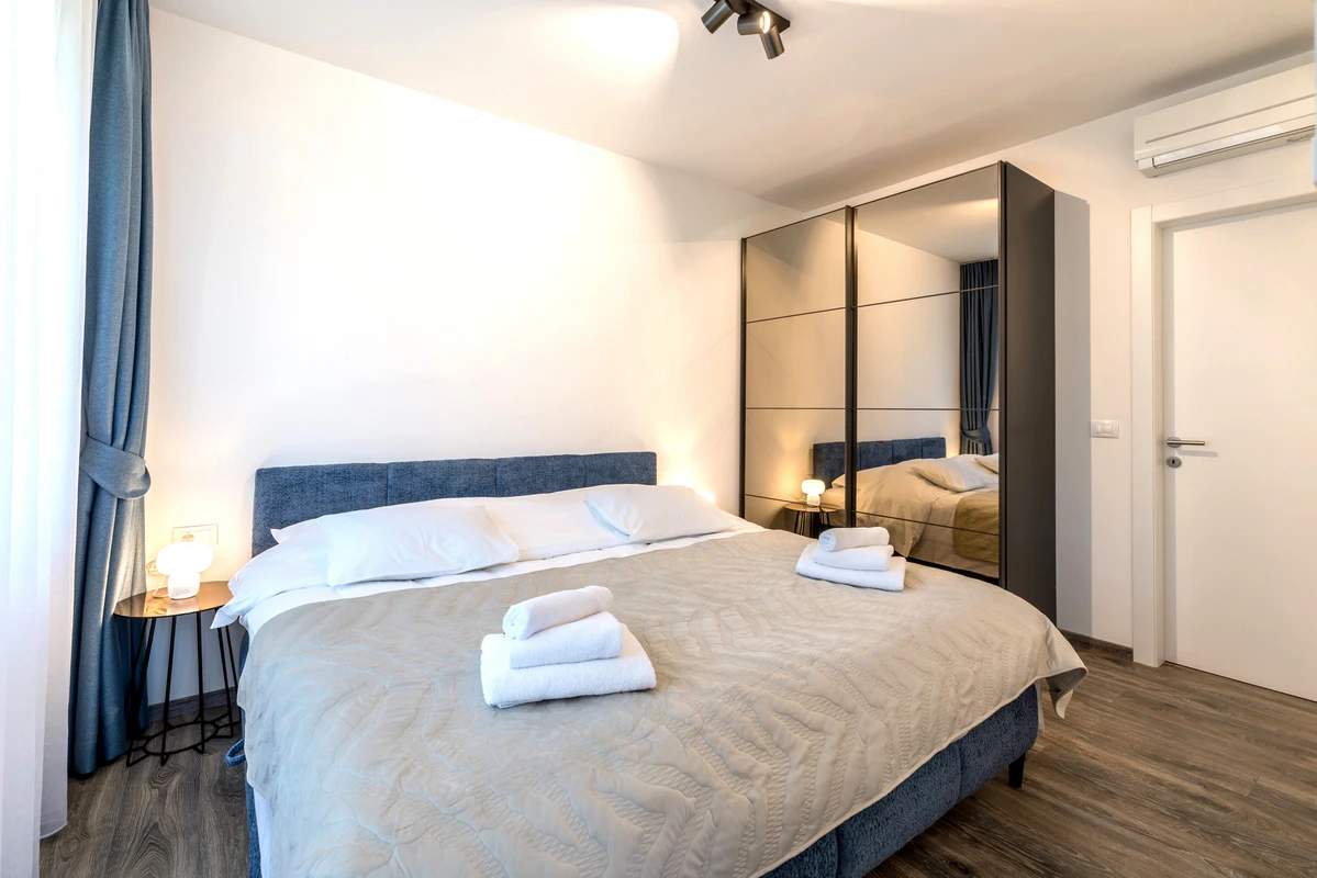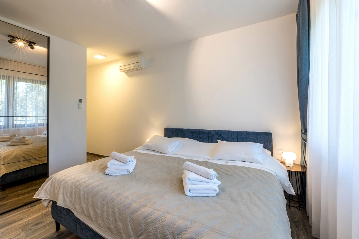 Lussuoso appartamento con due camere da letto (100 m²) dotato di letto king-size (200×200), aria condizionata e bagno privato con doccia walk-in in ogni camera da letto. Il soggiorno con ampie finestre affacciate sul mare è dotato di TV via cavo, WiFi e aria condizionata, con un divano che può ospitare una quinta persona (bambino) su richiesta.